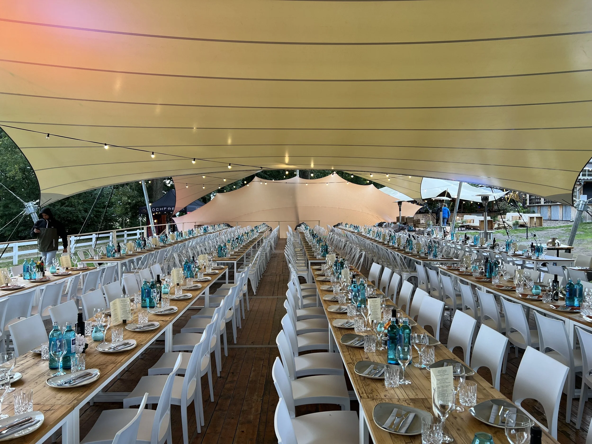 Ein echter Hingucker war auch die Location selbst: Die Kombination aus der Kochfabrik, einem Hotspot für feine Kulinarik, und dem Goldschätzchen, einer beliebten Hochzeits- und Eventlocation im Grünen, ist für viele Veranstalter eine Traumkulisse. Doch Träume wollen vorbereitet werden: Das Gelände hatte nämlich einen Höhenunterschied von einem ganzen Meter – quer über die Fläche, auf der das Zelt stehen sollte.